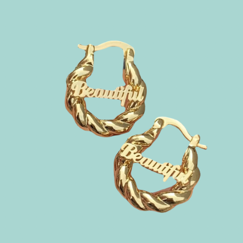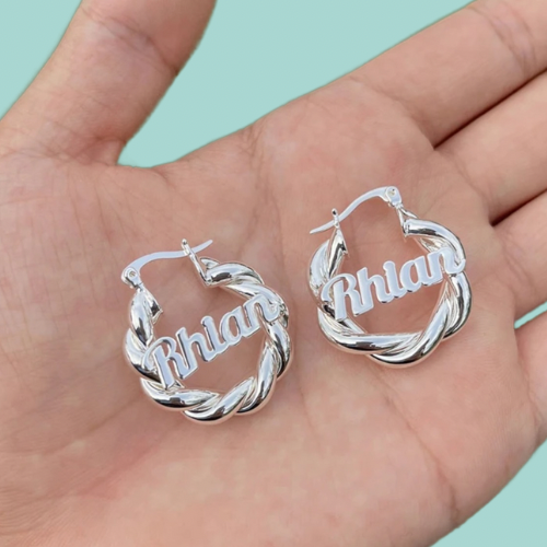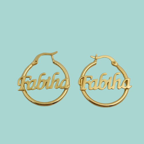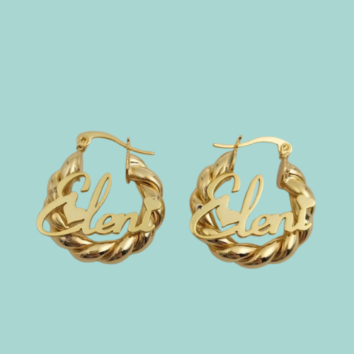 Our personalized Name Earrings. That comes in GOLD & SILVER. 18 karat gold plated. The turnover time is 2 to 4 weeks. We do not recommend showering with Custom Jewelry on, and to keep in the dusk bag that it comes in when not wearing.