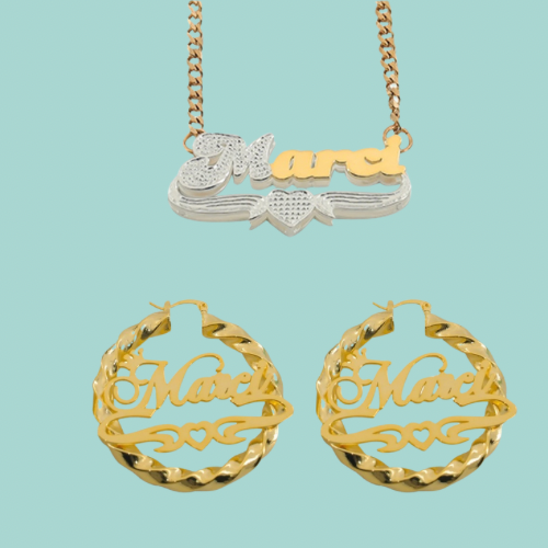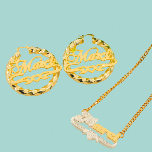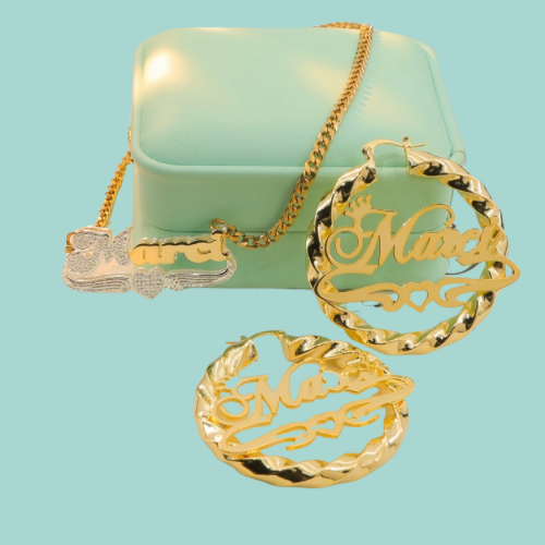 Our personalized twist set. That comes in GOLD & SILVER. 18 karat gold plated. The turnover time is 2 to 4 weeks. We do not recommend showering with Custom Jewelry on, and to keep in the dusk bag that it comes in when not wearing.